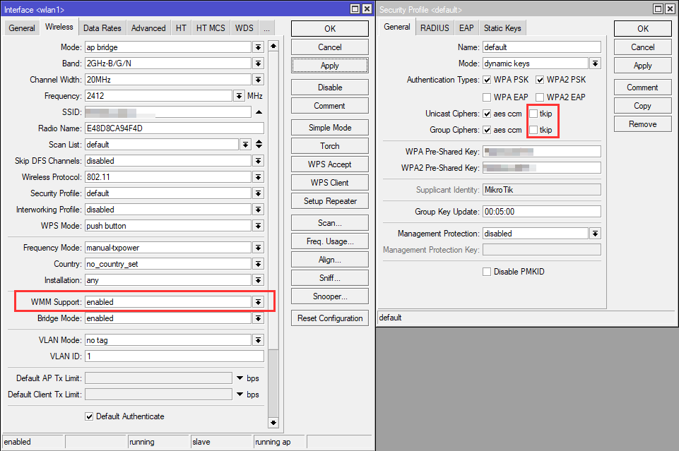 необходимо учесть следующие моменты: в настройках беспроводного интерфейса должен быть включен WMM support (wi-fi multimedia) и выключено шифрование tkip в настройках Security Profile